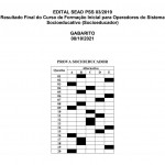 Obs: Conforme exigido no Edital SEAD PSS-003/2019 é necessário para aprovação no Curso de Formação o percentual mínimo de 60% de acertos na prova objetiva e 75% de frequência. Logo, os candidatos que atingiram estes percentuais consideram-se APROVADOS, e aqueles que não compareceram ao curso e não apresentaram documento de justificativa formal consideram-se ELIMINADOS do certame.
